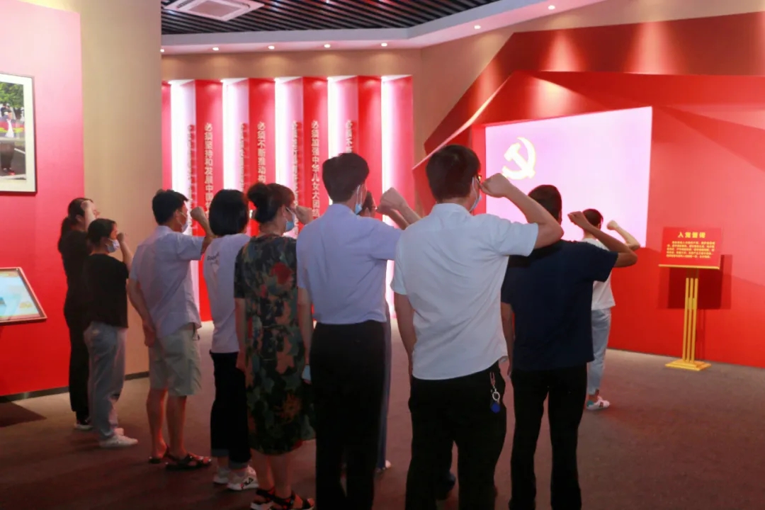 参观结束后,我院党员在党支部书记李玉静的带领下,面对鲜红的党旗,高举右拳,重温入党誓词,回望初心使命。
