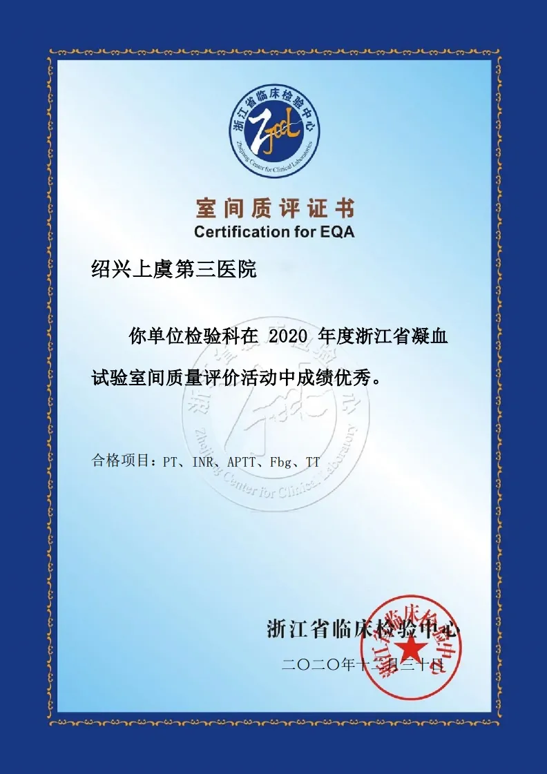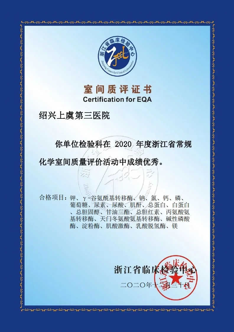 近日,上虞第三医院检验科顺利通过浙江省室间质量评价,参评的常规化学、血常规类、凝血试验、尿液化学分析4个项目全部获得优异成绩!