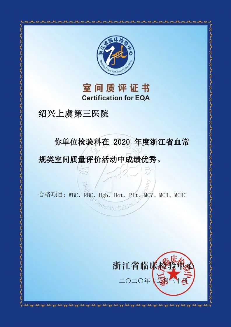 上虞第三医院将以此为契机,再接再厉,将室间质评工作继续做好做精,持续提高实验室人员队伍素质,提升检验质量水平,为临床科室提供准确的检验数据。