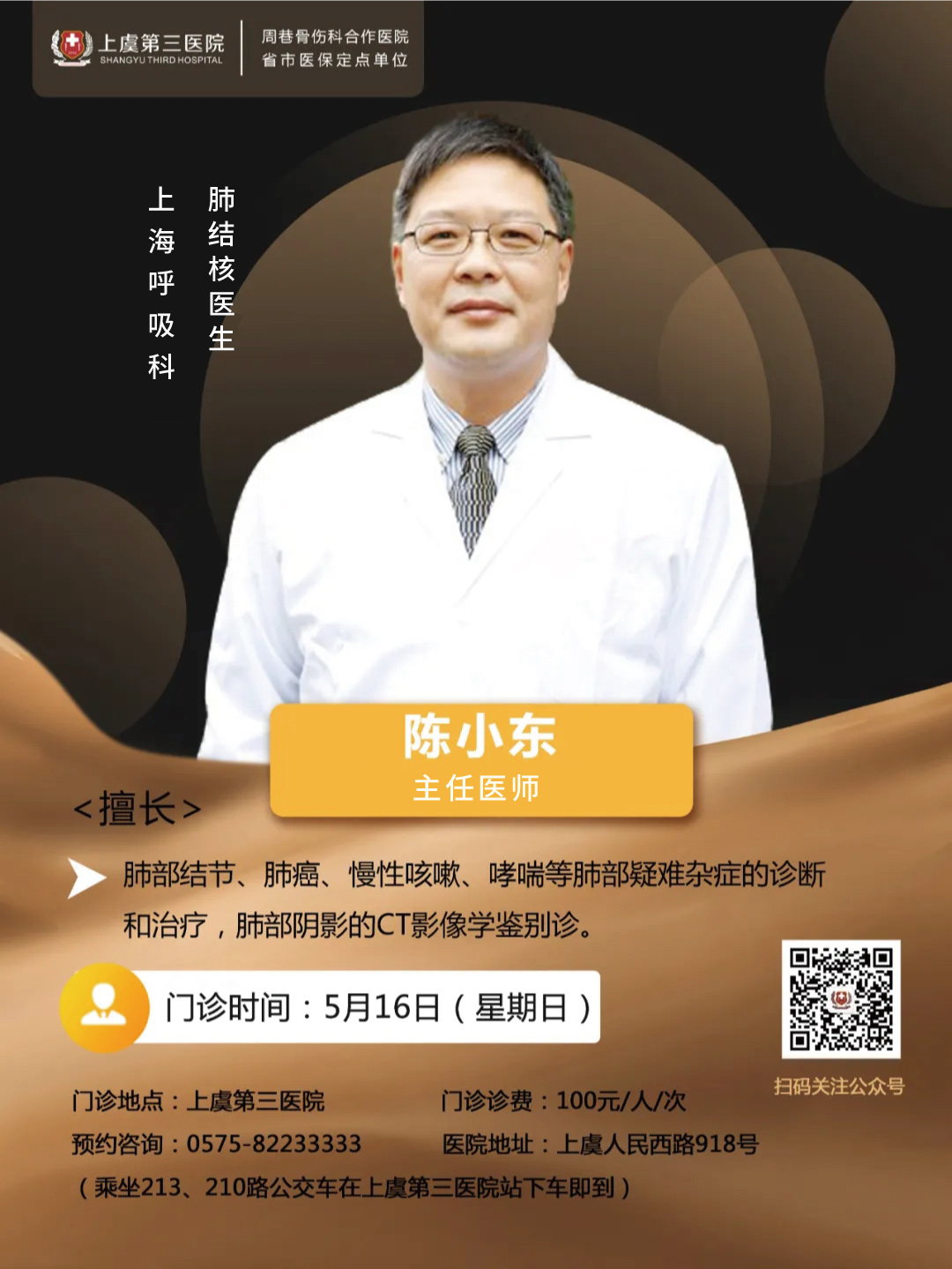 肺结节=肺癌?呼吸科陈小东主任医师本周日来上虞第三医院坐诊